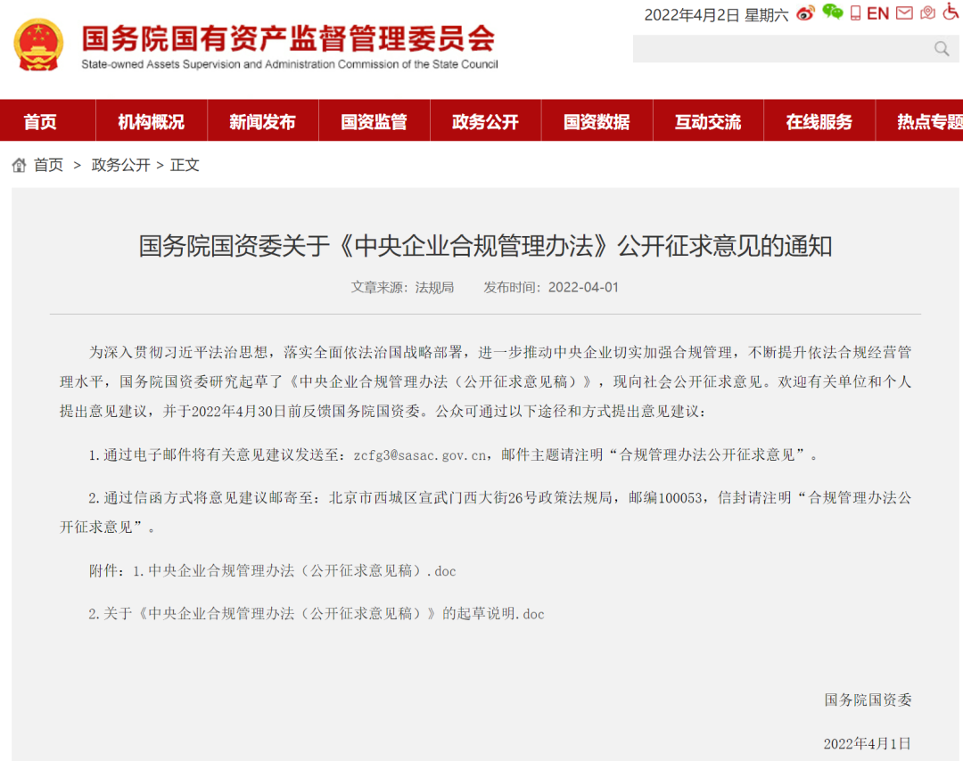 進一步推動中央企業切實加強合規管理,不斷提升依法合規經營管理水平,4月1日,國務院國資委對外發布《中央企業合規管理辦法(公開征求意見稿)》(以下簡稱《辦法》),并向社會公開征求意見。
