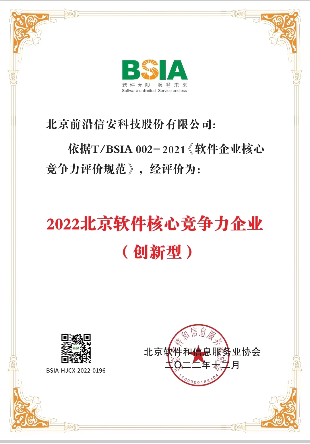 2022年12月,依據T/BSIA 002-2021《軟件企業核心競爭力評價規范》前沿信安取得了2022北京軟件核心競爭力企業(創新型)認定證書