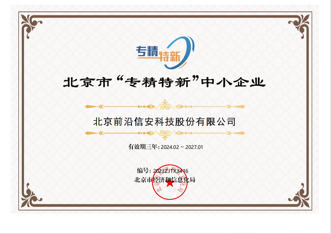2023年4月,按照工業和信息化部《優質中小企業梯度培育管理暫行辦法》(工信部企業〔2022〕63號)、《北京市優質中小企業梯度管理實施細則》要求,前沿信安取得了2023年北京市“創新型”中小企業認定證書。